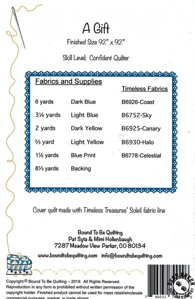 A Gift Quilt Pattern View Larger Image Price: SALE $8.39 2 item(s) available. Item # PTN-BTBQ144 | Reg. $11.99 Tweet Pin It A Gift Quilt PatternFeatured quilt pattern for the Bear Creek Quilting Company exclusive Tranquility Mystery Quilt. Pattern and instructions; fabric not included Finished size is 92 inches by 92 inches Authored by Pat Syta and Mimi Hollenbaugh Published by Bound To Be Quilting Copyright 2019 Related Products Arbor Stroll Quilt Pattern Item # PTN-BTBQ444 | Reg. $11.99 SALE from $8.39 Belle Blooms Quilt Pattern Item # PTN-BTBQ229 | Reg. $24.99 SALE from $17.49 Intertwined Stars Quilt Pattern Item # PTN-BTBQ432 | Reg. $11.99 SALE from $8.39 Snowy Gathering Quilt Pattern Item # PTN-BTBQ364 | Reg. $11.99 SALE from $8.39 Starlight Cabins Quilt Pattern Item # PTN-BTBQ431 | Reg. $11.99 SALE from $8.39