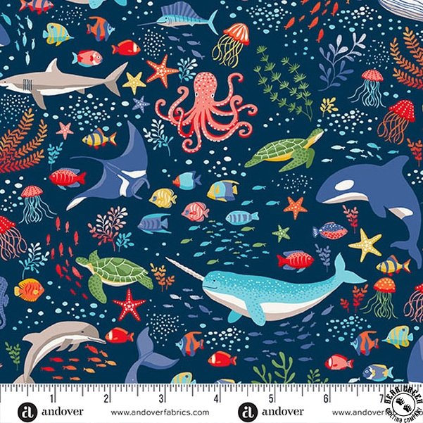 Andover Fabrics Deep Blue Sea Creatures Dark Blue
