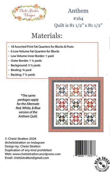 Anthem Quilt Pattern View Larger Image Price: SALE $8.39 5 item(s) available. Item # PTN-CSD-164 | Reg. $11.99 Tweet Pin It Anthem Quilt PatternFeaturing the Raspberry Summer fabric collection by Moda. Pattern and instructions; fabric not included Finished size is 81 1/2 inches by 81 1/2 inches Authored by Chelsi Stratton and Published by Chelsi Stratton Designs Copyright 2025 Related Products Bountiful Baskets Quilt Pattern Item # PTN-CSD-165 | Reg. $11.99 SALE from $8.39 Star Bright 2 Quilt Pattern Item # PTN-QLD-256 | Reg. $11.99 SALE from $8.39 Star Crossed Remix Quilt Pattern Item # PTN-CSD-168 | Reg. $11.99 SALE from $8.39 Sweet Adventure Quilt Pattern Item # PTN-CSD-166 | Reg. $11.99 SALE from $8.39