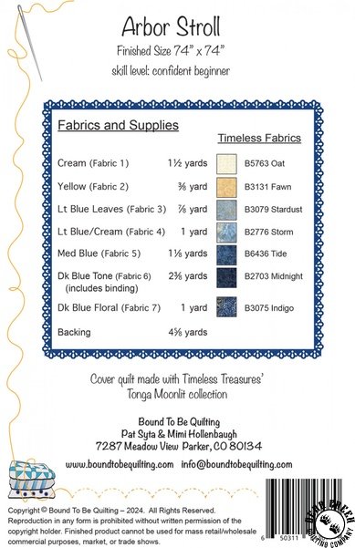 Arbor Stroll Quilt Pattern View Larger Image Price: SALE $8.39 1 item(s) available. Item # PTN-BTBQ444 | Reg. $11.99 Tweet Pin It Arbor Stroll Quilt PatternFeaturing the Tonga Moonlit Batiks fabric collection by Timeless Treasures. Pattern and instructions; fabric not included Finished size is 74 inches by 74 inches Authored by Pat Syta and Mimi Hollenbaugh Published by Bound To Be Quilting Copyright 2024 Related Products A Gift Quilt Pattern Item # PTN-BTBQ144 | Reg. $11.99 SALE from $8.39 Arbor Stroll Quilt Pattern Item # PTN-BTBQ444 | Reg. $11.99 SALE from $8.39 Belle Blooms Quilt Pattern Item # PTN-BTBQ229 | Reg. $24.99 SALE from $17.49 Timeless Treasures Tonga Batik Moonlit Flower Geo Oat Item # B5763-OAT | Reg. $12.99 SALE from $9.09 Timeless Treasures Tonga Batik Moonlit Heart Shape Leaves Stardust Item # B3079-STARDUST | Reg. $12.99 SALE from $9.09 Timeless Treasures Tonga Batik Moonlit Large Flowers Indigo Item # B3075-INDIGO | Reg. $12.99 SALE from $9.09 Timeless Treasures Tonga Batik Moonlit Medallions Fawn Item # B3131-FAWN | Reg. $12.99 SALE from $9.09