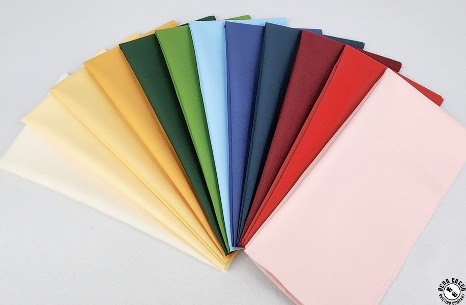 Calling all Bella Solids lovers! Currently there are over 300 colors in the Moda Bella Solids fabric collection. Bella Solids are dyed, not printed, so they do not have a right or wrong side.
