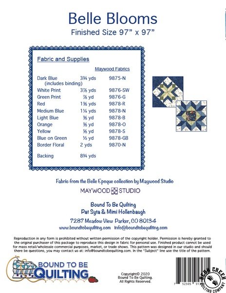 Belle Blooms Quilt Pattern View Larger Image Price: SALE $17.49 31 item(s) available. Item # PTN-BTBQ229 | Reg. $24.99 Tweet Pin It Belle Blooms Quilt PatternFeatured quilt pattern for the Bear Creek Quilting Company exclusive Friendship Mystery Quilt. Pattern and instructions; fabric not included Finished size is 97 inches by 97 inches Authored by Pat Syta and Mimi Hollenbaugh Published by Bound To Be Quilting Copyright 2020 Related Products Arbor Stroll Quilt Pattern Item # PTN-BTBQ444 | Reg. $11.99 SALE from $8.39 Intertwined Stars Quilt Pattern Item # PTN-BTBQ432 | Reg. $11.99 SALE from $8.39 Snowy Gathering Quilt Pattern Item # PTN-BTBQ364 | Reg. $11.99 SALE from $8.39 Starlight Cabins Quilt Pattern Item # PTN-BTBQ431 | Reg. $11.99 SALE from $8.39