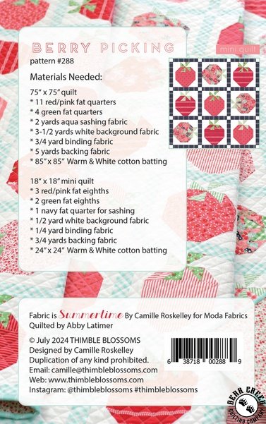 Berry Picking Quilt Pattern View Larger Image Price: SALE $8.39 4 item(s) available. Item # PTN-288 | Reg. $11.99 Pin It Berry Picking Quilt PatternFeaturing the Summertime fabric collection by Moda. Pattern and instructions; fabric not included Finished size is 75 inches by 75 inches Designed by Camille Rosekelley Published by Thimble Blossoms Copyright 2025 Related Products Summer Love Quilt Pattern Item # PTN-287 | Reg. $11.99 SALE from $8.39 Summertime Fat Quarter Bundle by Moda Item # 55320AB | Reg. $159.99 SALE from $111.99