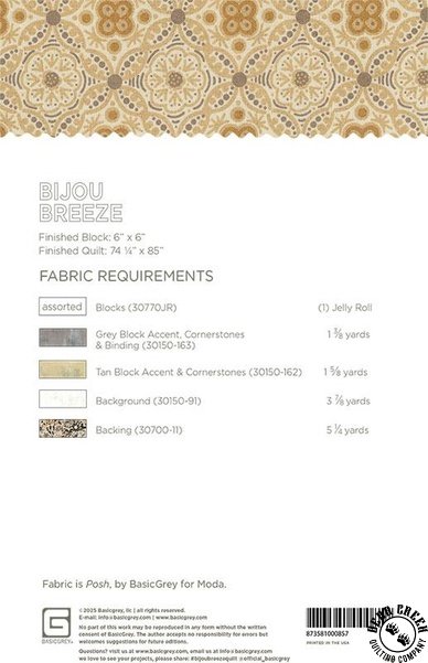 Bijou Breeze Quilt Pattern View Larger Image Price: $11.99 6 item(s) available. Item # PTN-BG-PAT085 Pin It Bijou Breeze Quilt PatternFeaturing the Posh fabric collection by Moda. Pattern and instructions; fabric not included Finished size is 74 1/4 inches by 85 inches Designed by BasicGrey Published by Moda Copyright 2025 Related Products Moda Posh Chantilly Desert Dusk Item # 30770-17 $13.99 Moda Posh Chantilly Ivory Whisper Item # 30770-11 $13.99 Moda Posh Chantilly Noir Item # 30770-21 $13.99 Moda Posh Chantilly Onyx Noir Item # 30770-12 $13.99 Moda Posh Doily Desert Dusk Item # 30777-14 $13.99 Moda Posh Doily Dusk Item # 30777-17 $13.99 Moda Posh Doily Ivory Whisper Item # 30777-12 $13.99 Moda Posh Doily Ivory Whisper/White Item # 30777-11 $13.99 Moda Posh Doily Onyx Noir Item # 30777-18 $13.99 Moda Posh Echo Desert Dusk Item # 30771-14 $13.99 Moda Posh Echo Dusk Item # 30771-23 $13.99 Moda Posh Echo Shadow Mist Item # 30771-15 $13.99 Moda Posh Filigree Ivory Whisper Item # 30772-11 $13.99 Moda Posh Filigree Onyx Noir Item # 30772-15 $13.99 Moda Posh Filigree Shadow Mist Item # 30772-12 $13.99 Moda Posh Fretwork Desert Dusk Item # 30775-14 $13.99 Moda Posh Fretwork Ivory Whisper Item # 30775-12 $13.99 Moda Posh Fretwork Onyx Noir Item # 30775-19 $13.99 Moda Posh Lace Muse Desert Dusk Item # 30774-22 $13.99 Moda Posh Lace Muse Onyx Noir Item # 30774-14 $13.99 Moda Posh Lace Muse Shadow Mist Item # 30774-13 $13.99 Moda Posh Lace Muse Vanilla Cream Item # 30774-12 $13.99 Moda Posh Netting Dusk Item # 30776-15 $13.99 Moda Posh Netting Ivory Whisper Item # 30776-11 $13.99 Moda Posh Netting Onyx Noir Item # 30776-14 $13.99 Moda Posh Threadwork Ivory Whisper Item # 30773-11 $13.99 Moda Posh Threadwork Onyx Noir Item # 30773-18 $13.99 Moda Posh Threadwork Shadow Mist Item # 30773-15 $13.99 Posh Charm Pack by Moda Item # 30770PP $12.99 Posh Fat Quarter Bundle by Moda Item # 30770AB $139.99 Posh Jelly Roll by Moda Item # 30770JR $49.99 Posh Layer Cake by Moda Item # 30770LC $49.99