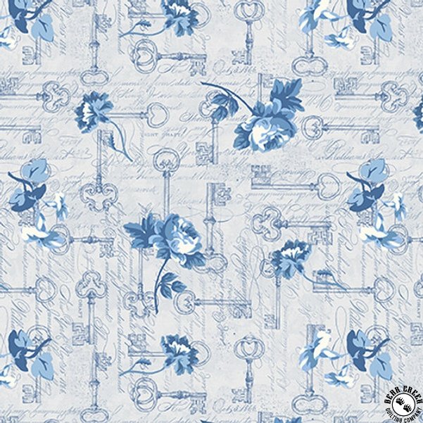 Blank Quilting English Blue and White Flowers with Keys Light Gray
