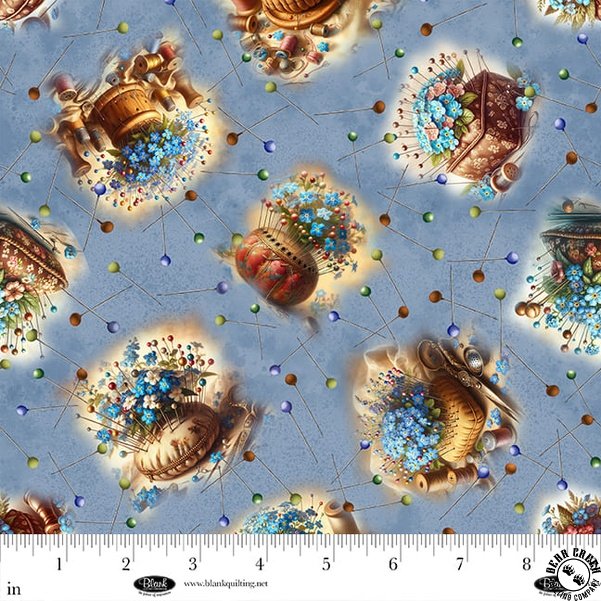 Forget Me Not  is sew cute!  Pause your current project and pick up a few yards featuring whimsical thread, scissors, and pincushion motifs—everything a maker needs, printed right on the fabric.  Elegant tape measures draped across delicate doilies add a cheerful pop of yellow, while the sewing machine panel makes the perfect centerpiece for a quilt or a charming wall hanging in your sewing room.  With Forget Me Not,  creativity is always close at hand—so get stitching and let your projects bloom!