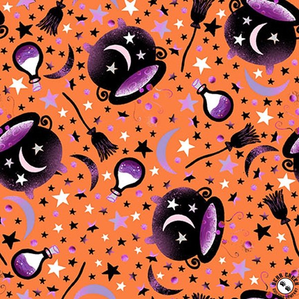 Blank Quilting Ghostly Greetings Cauldrons Orange