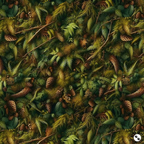 Blank Quilting Wilderness Song Forest Moss Leaves and Pinecones Green