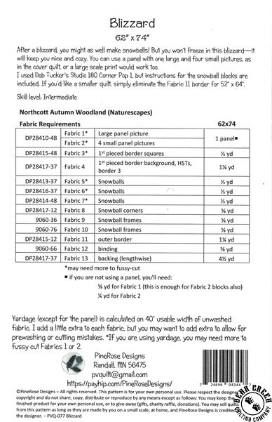 Blizzard Quilt Pattern View Larger Image Price: SALE $9.79 6 item(s) available. Item # PTN-3530/PVQ-077 | Reg. $13.99 Tweet Pin It Blizzard Quilt PatternFeaturing the Naturescapes Autumn Woodland fabric collection by Northcott. Pattern and instructions; fabric not included Finished size is 62 inches by 74 inches Designed by Eileen Hoheisel Published by Pine Rose Designs Copyright 2025 Related Products Northcott Naturescapes Autumn Woodland Lily Pads Blue/Multi Item # DP28414-48 | Reg. $12.99 SALE from $9.09 Northcott Naturescapes Autumn Woodland Marble Green Item # DP28417-76 | Reg. $12.99 SALE from $9.09 Northcott Naturescapes Autumn Woodland Scenic Blue/Multi Item # DP28412-48 | Reg. $12.99 SALE from $9.09