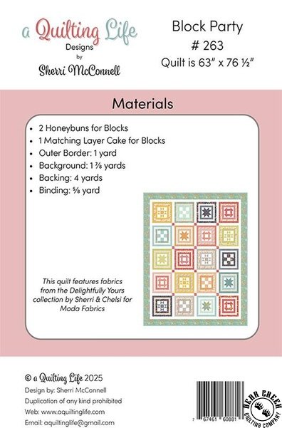 Block Party Quilt Pattern View Larger Image Price: SALE $7.69 11 item(s) available. Item # PTN-#263 | Reg. $10.99 Tweet Pin It Block Party Quilt PatternFeaturing the Delightfully Yours fabric collection by Moda. Pattern and instructions; fabric not included Finished size is 63 inches by 76 1/2 inches Designed by Sherri McConnell Published by A Quilting Life Designs Copyright 2025 Related Products Delightfully Yours Fat Quarter Bundle by Moda Item # 37700AB | Reg. $159.99 SALE from $111.99 Delightfully Yours Jelly Roll by Moda Item # 37700JR | Reg. $49.99 SALE from $34.99 Delightfully Yours Layer Cake by Moda Item # 37700LC | Reg. $49.99 SALE from $34.99 Delightfully Yours Spring Town Quilt Kit Item # KIT-37700 | Reg. $169.99 SALE from $118.99 Moda Delightfully Yours 108 Inch Wide Backing Fabric Wildflower Cloud Item # 108035-11 | Reg. $24.99 SALE from $17.49 Moda Delightfully Yours 108 Inch Wide Backing Fabric Wildflower Geranium Item # 108035-16 | Reg. $24.99 SALE from $17.49 Moda Delightfully Yours 108 Inch Wide Backing Fabric Wildflower Navy Item # 108035-19 | Reg. $24.99 SALE from $17.49 Moda Delightfully Yours Blooms Carnation Item # 37703-15 | Reg. $12.99 SALE from $9.09 Moda Delightfully Yours Blooms Cloud Item # 37703-11 | Reg. $12.99 SALE from $9.09 Moda Delightfully Yours Blooms Poolside Item # 37703-18 | Reg. $12.99 SALE from $9.09 Moda Delightfully Yours Blossoms Aqua Item # 37701-17 | Reg. $12.99 SALE from $9.09 Moda Delightfully Yours Blossoms Chartreuse Item # 37701-14 | Reg. $12.99 SALE from $9.09 Moda Delightfully Yours Blossoms Cloud - White Item # 37701-21 | Reg. $12.99 SALE from $9.09 Moda Delightfully Yours Blossoms Stone Item # 37701-20 | Reg. $12.99 SALE from $9.09 Moda Delightfully Yours Dots Apricot Item # 37707-13 | Reg. $12.99 SALE from $9.09 Moda Delightfully Yours Dots Buttercup Item # 37707-12 | Reg. $12.99 SALE from $9.09 Moda Delightfully Yours Dots Chartreuse Item # 37707-14 | Reg. $12.99 SALE from $9.09 Moda Delightfully Yours Dots Cloud Item # 37707-11 | Reg. $12.99 SALE from $9.09 Moda Delightfully Yours Flora Cloud/Geranium Item # 37706-21 | Reg. $12.99 SALE from $9.09 Moda Delightfully Yours Flora Geranium Item # 37706-16 | Reg. $12.99 SALE from $9.09 Moda Delightfully Yours Floral Cloud Item # 37706-11 | Reg. $12.99 SALE from $9.09 Moda Delightfully Yours Posie Buttercup Item # 37705-12 | Reg. $12.99 SALE from $9.09 Moda Delightfully Yours Posie Carnation Item # 37705-15 | Reg. $12.99 SALE from $9.09 Moda Delightfully Yours Posie Cloud Item # 37705-11 | Reg. $12.99 SALE from $9.09 Moda Delightfully Yours Posie Geranium Item # 37705-16 | Reg. $12.99 SALE from $9.09 Moda Delightfully Yours Posie Navy Item # 37705-19 | Reg. $12.99 SALE from $9.09 Moda Delightfully Yours Posie Poolside Item # 37705-18 | Reg. $12.99 SALE from $9.09 Moda Delightfully Yours Wildflower Cloud Item # 37700-11 | Reg. $12.99 SALE from $9.09 Moda Delightfully Yours Wildflower Geranium Item # 37700-16 | Reg. $12.99 SALE from $9.09 Moda Delightfully Yours Wildflower Navy Item # 37700-19 | Reg. $12.99 SALE from $9.09 Moda Delightfully Yours Wildflower Poolside Item # 37700-18 | Reg. $12.99 SALE from $9.09 Simply Sweet Quilt Pattern Item # PTN-#170 | Reg. $11.99 SALE from $8.39 Spring Town Quilt Pattern Item # PTN-#172 | Reg. $11.99 SALE from $8.39