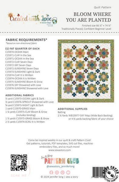 Bloom Where You Are Planted Quilt Pattern View Larger Image Price: SALE $7.79 10 item(s) available. Item # PTN-347 | Reg. $12.99 Tweet Pin It Bloom Where You Are Planted Quilt PatternFeaturing the Created with Love fabric collection by Riley Blake Designs. Pattern and instructions; fabric not included Finished size is 67 1/2 inches by 75 1/2 inches Designed by Jennifer Long Published by Sew A Story Copyright 2025 Related Products Created with Love Soft Book Panel Quilt Free Quilt Pattern Item # created-with-love-soft-book-panel-quilt-free-quilt-pattern $0.00 Riley Blake Designs Created with Love Bloom and Grow Clay Item # C15975-CLAY | Reg. $10.99 SALE from $6.59 Riley Blake Designs Created with Love Bloom and Grow Grass Item # C15975-GRASS | Reg. $10.99 SALE from $6.59 Riley Blake Designs Created with Love Felt Panel Item # FT15979-PANEL | Reg. $19.99 SALE from $11.99 Riley Blake Designs Created with Love In the Sea Clay Item # C15971-CLAY | Reg. $10.99 SALE from $6.59 Riley Blake Designs Created with Love In the Sea Ecru Item # C15971-ECRU | Reg. $10.99 SALE from $6.59 Riley Blake Designs Created with Love It Is Written Clay Item # C15974-CLAY | Reg. $10.99 SALE from $6.59 Riley Blake Designs Created with Love It Is Written Ocean Item # C15974-OCEAN | Reg. $10.99 SALE from $6.59 Riley Blake Designs Created with Love Light and Dark Night Item # C15973-NIGHT | Reg. $10.99 SALE from $6.59 Riley Blake Designs Created with Love Light and Dark Ocean Item # C15973-OCEAN | Reg. $10.99 SALE from $6.59 Riley Blake Designs Created with Love Main Cloud Item # C15970-CLOUD | Reg. $10.99 SALE from $6.59 Riley Blake Designs Created with Love Main Grass Item # C15970-GRASS | Reg. $10.99 SALE from $6.59 Riley Blake Designs Created with Love Seven Days Clay Item # C15972-CLAY | Reg. $10.99 SALE from $6.59 Riley Blake Designs Created with Love Seven Days Sky Item # C15972-SKY | Reg. $10.99 SALE from $6.59 Riley Blake Designs Created with Love Seven Days Sunshine Item # C15972-SUNSHINE | Reg. $10.99 SALE from $6.59 Riley Blake Designs Created with Love Showered with Love Sprout Item # C15976-SPROUT | Reg. $10.99 SALE from $6.59 Riley Blake Designs Created with Love Showered with Love Sunshine Item # C15976-SUNSHINE | Reg. $10.99 SALE from $6.59 Seahorse School Quilt Pattern Item # PTN-345 | Reg. $12.99 SALE from $7.79