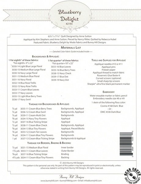 Blueberry Delight Quilt Pattern View Larger Image Price: SALE $19.60 6 item(s) available. Item # PTN-2193 | Reg. $49.99 Tweet Pin It Blueberry Delight Quilt PatternFeaturing the Blueberry Delight fabric collection by Moda. Pattern and instructions; fabric not included Finished size is 63 inches by 71 inches Authored by Anne Sutton Published by Bunny Hill Designs Copyright 2023