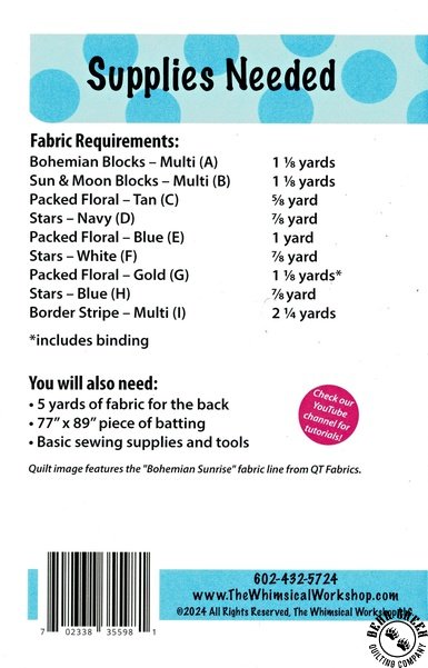 Boho Sunrise Quilt Pattern View Larger Image Price: SALE $3.50 3 item(s) available. Item # PTN-1024 | Reg. $13.99 Pin It Boho Sunrise Quilt PatternFeaturing the Bohemian Sunrise fabric collection by QT Fabrics. Pattern and instructions; fabric not included Finished size is 69 inches by 81 inches Designed by Matthew Pridemore Published by The Whimiscal Workshop Copyright 2025 Related Products QT Fabrics Bohemian Sunrise Clouds Cream Item # 31091-E | Reg. $11.99 SALE from $6.00
