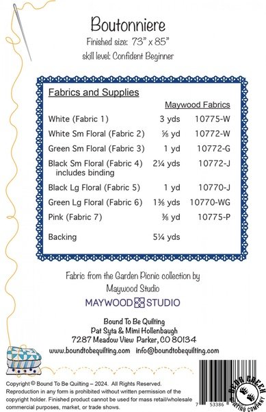Boutonniere Quilt Pattern View Larger Image Price: SALE $8.39 21 item(s) available. Item # PTN-BTBQ517 | Reg. $11.99 Pin It Boutonniere Quilt PatternFeaturing the Garden Picnic fabric collection by Maywood Studio. Pattern and instructions; fabric not included Finished size is 73 inches by 65 inches Authored by Pat Syta and Mimi Hollenbaugh Published by Bound To Be Quilting Copyright 2025 Related Products Garden Picnic Fat Quarter Bundle by Maywood Studio Item # FQ-MASGAPI | Reg. $69.99 SALE from $48.99 Garden Picnic Free Quilt Pattern Item # garden-picnic-free-quilt-pattern $0.00