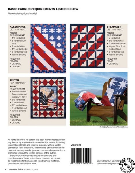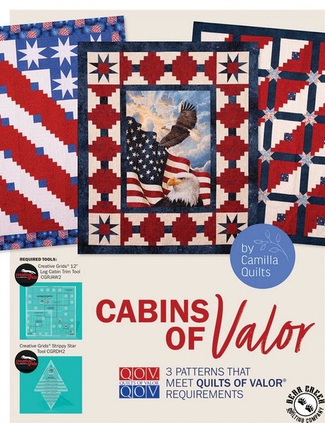 Cabins of Valor Quilt Pattern View Larger Image Price: SALE $9.59 7 item(s) available. Item # PTN-VALOR024 | Reg. $11.99 Tweet Pin It Cabins of Valor Quilt PatternThree patterns that meet Quilts of Valor requirements! Pattern and instructions; fabric not included Finished quilt measures: Allegiance = 60 inches by 84 inches Steadfast = 65 inches by 80 inches United = 68 inches by 80 inches Designed by Cam Kilman Published by Camilla quilts Copyright 2025 Required tools: Creative Grids Log Cabin Trim Tool 6 Inch & 12 Inch Finished Blocks; sold separately Creative Grids Strippy Stars Tool; sold separately Related Products Cactus in the Cabin Quilt Pattern - PDF DOWNLOAD Item # PDF-PTN-CACTUS-CABIN $11.99 Creative Grids Strippy Stars Tool Item # CGRDH2+PTN | Reg. $24.99 SALE from $19.99 Geese In The Cabin Quilt Pattern Item # PTN-CLPPLUSCAM001 | Reg. $6.99 SALE from $5.59
