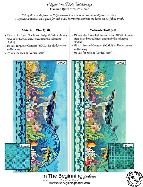 Calypso One Fabric Kaleidoscope Quilt Pattern View Larger Image Price: SALE $2.79 2 item(s) available. Item # PTN-CAL-ONE-KAL | Reg. $3.99 Tweet Pin It Calypso One Fabric Kaleidoscope QuiltFeaturing the Calypso fabric collection by In The Beginning Fabrics. Pattern and instructions; fabric not included Finished quilt measures 63 inches by 85 1/2 inches Designed and published by Jason Yenter of In The Beginning Fabrics Copyright 2019