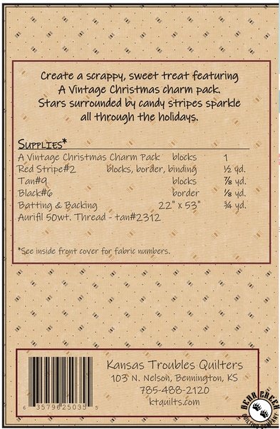 Candy Stripe Stars Quilt Pattern View Larger Image Price: SALE $6.99 10 item(s) available. Item # PTN-KT25035 | Reg. $9.99 Tweet Pin It Candy Stripe Stars Quilt PatternFeaturing the A Vintage Christmas fabric collection by Moda. Pattern and instructions; fabric not included Finished size is 18 inches by 39 inches Designed by Lynne Hagmeier Published by Kansas Troubles Quilters Copyright 2025 Related Products Christmas Bells Quilt Pattern Item # PTN-KT55154 | Reg. $9.99 SALE from $6.99