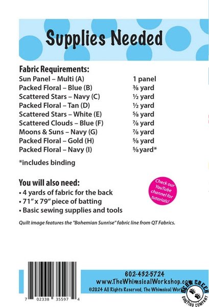 Celestial Dance Quilt Pattern View Larger Image Price: SALE $9.79 5 item(s) available. Item # PTN-1023 | Reg. $13.99 Tweet Pin It Celestial Dance Quilt PatternFeaturing the Bohemian Sunrise fabric collection by QT Fabrics. Pattern and instructions; fabric not included Finished size is 63 inches by 71 inches Designed by Matthew Pridemore Published by The Whimiscal Workshop Copyright 2025 Related Products Boho Sunrise Quilt Pattern Item # PTN-1024 | Reg. $13.99 SALE from $9.79 QT Fabrics Bohemian Sunrise Clouds Cream Item # 31091-E | Reg. $11.99 SALE from $6.26 QT Fabrics Bohemian Sunrise Clouds Navy Item # 31091-N | Reg. $11.99 SALE from $6.26
