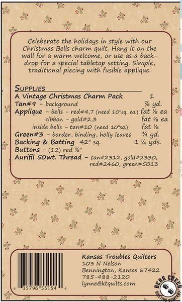 Christmas Bells Quilt Pattern View Larger Image Price: SALE $6.99 3 item(s) available. Item # PTN-KT55154 | Reg. $9.99 Tweet Pin It Christmas Bells Quilt PatternFeaturing the A Vintage Christmas fabric collection by Moda. Pattern and instructions; fabric not included Finished size is 38 inches by 38 inches Designed by Lynne Hagmeier Published by Kansas Troubles Quilters Copyright 2025 Related Products Candy Stripe Stars Quilt Pattern Item # PTN-KT25035 | Reg. $9.99 SALE from $6.99