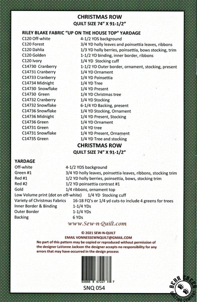 Christmas Row Quilt Pattern View Larger Image Price: SALE $6.99 69 item(s) available. Item # PTN-P188-CHRISTMASROW | Reg. $9.99 Pin It Christmas Row Quilt PatternFeaturing the Up on the Housetop fabric collection by Riley Blake Designs. Pattern and instructions; fabric not included Finished quilt measures 74 inches by 91 1/2 inches Designed by LaVonne Jackson Published by Sew-n-Quilt Copyright 2024 Related Products Up on the Housetop Free Quilt Pattern Item # up-on-the-housetop-free-quilt-pattern $0.00 Up on the Housetop Santa Stop Here Free Quilt Pattern Item # up-on-the-housetop-santa-stop-here-free-quilt-pattern $0.00