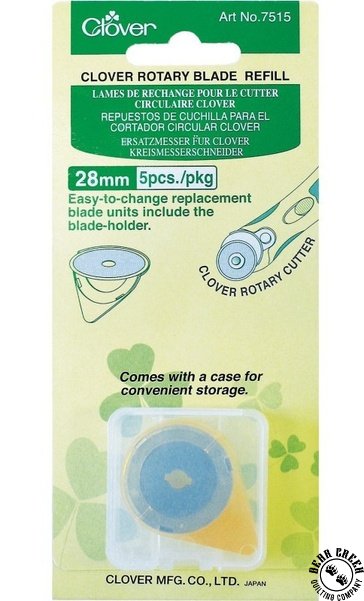Clover 28mm Rotary Cutter Blade Refill View Larger Image Price: SALE $13.29 3 item(s) available. Item # CLOVER-7515 | Reg. $18.99 Tweet Pin It Clover Rotary Cutter Blade Refill 5 - 28mm rotary cutter blade refills with convenient plastic storage case Manufactured by Clover Manufacturing Co. Related Products Clover 28mm Rotary Cutter Item # CLOVER-7501 | Reg. $14.99 SALE from $10.49 Clover 45mm Rotary Cutter Item # CLOVER-7500 | Reg. $19.99 SALE from $13.99 Clover 45mm Rotary Cutter Blade Refill Item # CLOVER-7509 | Reg. $29.99 SALE from $20.99 Clover 60mm Rotary Cutter Item # 7502 | Reg. $29.99 SALE from $20.99 Clover 60mm Rotary Cutter Blade Refill Item # CLOVER-7511 | Reg. $49.99 SALE from $34.99 Clover Black Gold Applique/Sharps Sewing Needles #12 Item # CLOVER-4972 | Reg. $4.99 SALE from $3.49 Clover Curved Awl Item # CLOVER-4880 | Reg. $15.49 SALE from $10.84 Clover Desk Needle Threader - GREEN Item # 4072 | Reg. $15.49 SALE from $10.84 Clover Flower Head Pins - RED Item # CLOVER-2505 | Reg. $4.99 SALE from $3.49 Clover Magnet Pin Caddy - PINK Item # CLOVER-4105 | Reg. $19.99 SALE from $13.99 Clover Stitch Guide Item # CLOVER-9584 | Reg. $12.99 SALE from $9.09 Clover Sweet n Sharp Macaron Needle Sharpener - PISTACHIO Item # CLOVER-4131 | Reg. $11.99 SALE from $8.39 Clover Sweet n Sharp Macaron Needle Sharpener - RASPBERRY Item # CLOVER-4130 | Reg. $11.99 SALE from $8.39 Clover Thread Cutter Pendant - ANTIQUE GOLD Item # CLOVER-455 | Reg. $8.49 SALE from $5.94 Clover Thread Cutter Pendant - ANTIQUE SILVER Item # CLOVER-454 | Reg. $8.49 SALE from $5.94 Clover Wonder Clips 50 Pack - ASSORTED Item # CLOVER-3183 | Reg. $39.99 SALE from $27.99 Clover Wonder Clips 50 Pack - RED Item # CLOVER-3156 | Reg. $39.99 SALE from $27.99 Clover Yo Yo Maker - EXTRA LARGE Item # 8703 | Reg. $7.99 SALE from $5.59 Clover Yo Yo Maker - LARGE Item # 8701 | Reg. $7.99 SALE from $5.59