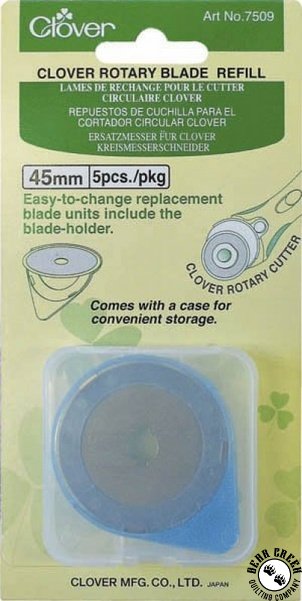 Clover 45mm Rotary Cutter Blade Refill View Larger Image Price: SALE $20.99 3 item(s) available. Item # CLOVER-7509 | Reg. $29.99 Tweet Pin It Clover Rotary Cutter Blade Refill 5 - 45mm rotary cutter blade refills with convenient plastic storage case Manufactured by Clover Manufacturing Co. Related Products Clover Desk Needle Threader - GREEN Item # 4072 | Reg. $15.49 SALE from $10.84 Clover Farm Row Quilt Pattern Item # PTN-P155-CLOVER | Reg. $9.99 SALE from $6.99 Clover Stitch Guide Item # CLOVER-9584 | Reg. $12.99 SALE from $9.09 Clover Sweet n Sharp Macaron Needle Sharpener - RASPBERRY Item # CLOVER-4130 | Reg. $11.99 SALE from $8.39 Clover Thread Cutter Pendant - ANTIQUE GOLD Item # CLOVER-455 | Reg. $8.49 SALE from $5.94 Clover Thread Cutter Pendant - ANTIQUE SILVER Item # CLOVER-454 | Reg. $8.49 SALE from $4.24