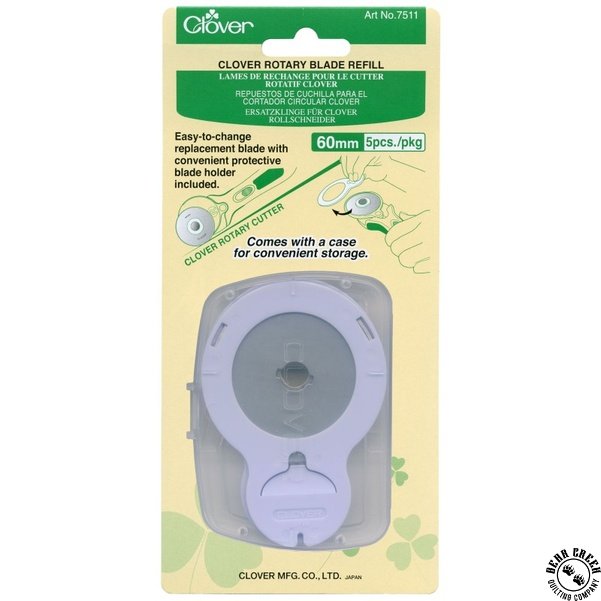Clover 60mm Rotary Cutter Blade Refill View Larger Image Price: SALE $34.99 2 item(s) available. Item # CLOVER-7511 | Reg. $49.99 Tweet Pin It Clover Rotary Cutter Blade Refill 5 - 60mm rotary cutter blade refills with convenient plastic storage case Manufactured by Clover Manufacturing Co. Related Products Clover 28mm Rotary Cutter Item # CLOVER-7501 | Reg. $14.99 SALE from $10.49 Clover 28mm Rotary Cutter Blade Refill Item # CLOVER-7515 | Reg. $18.99 SALE from $13.29 Clover 45mm Rotary Cutter Item # CLOVER-7500 | Reg. $19.99 SALE from $13.99 Clover 45mm Rotary Cutter Blade Refill Item # CLOVER-7509 | Reg. $29.99 SALE from $20.99 Clover 60mm Rotary Cutter Item # 7502 | Reg. $29.99 SALE from $20.99 Clover Black Gold Applique/Sharps Sewing Needles #12 Item # CLOVER-4972 | Reg. $4.99 SALE from $3.49 Clover Curved Awl Item # CLOVER-4880 | Reg. $15.49 SALE from $10.84 Clover Desk Needle Threader - GREEN Item # 4072 | Reg. $15.49 SALE from $10.84 Clover Flower Head Pins - RED Item # CLOVER-2505 | Reg. $4.99 SALE from $3.49 Clover Magnet Pin Caddy - PINK Item # CLOVER-4105 | Reg. $19.99 SALE from $13.99 Clover Stitch Guide Item # CLOVER-9584 | Reg. $12.99 SALE from $9.09 Clover Sweet n Sharp Macaron Needle Sharpener - PISTACHIO Item # CLOVER-4131 | Reg. $11.99 SALE from $8.39 Clover Sweet n Sharp Macaron Needle Sharpener - RASPBERRY Item # CLOVER-4130 | Reg. $11.99 SALE from $8.39 Clover Thread Cutter Pendant - ANTIQUE GOLD Item # CLOVER-455 | Reg. $8.49 SALE from $5.94 Clover Thread Cutter Pendant - ANTIQUE SILVER Item # CLOVER-454 | Reg. $8.49 SALE from $5.94 Clover Wonder Clips 50 Pack - ASSORTED Item # CLOVER-3183 | Reg. $39.99 SALE from $27.99 Clover Wonder Clips 50 Pack - RED Item # CLOVER-3156 | Reg. $39.99 SALE from $27.99 Clover Yo Yo Maker - EXTRA LARGE Item # 8703 | Reg. $7.99 SALE from $5.59 Clover Yo Yo Maker - LARGE Item # 8701 | Reg. $7.99 SALE from $5.59