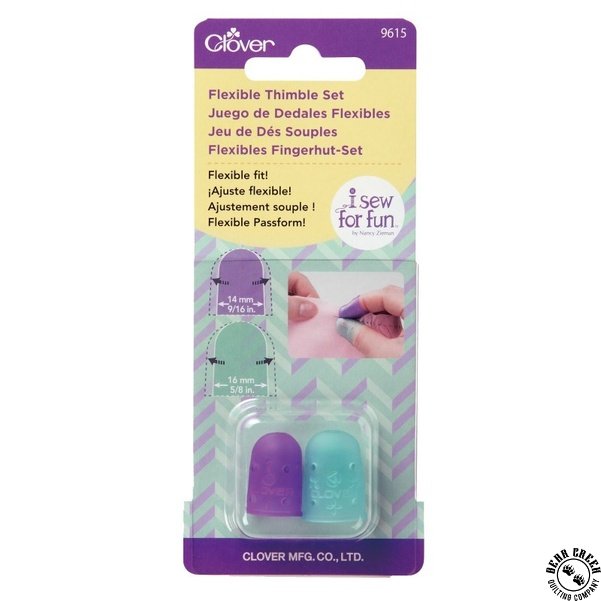 Index and thumb finger sheaths for ease in pulling needles through fabrics. Vents for breathability. Highly elastic thimbles fit most fingers.