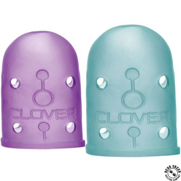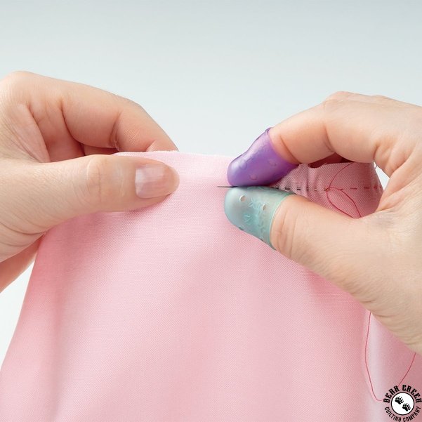 Index and thumb finger sheaths for ease in pulling needles through fabrics. Vents for breathability. Highly elastic thimbles fit most fingers.