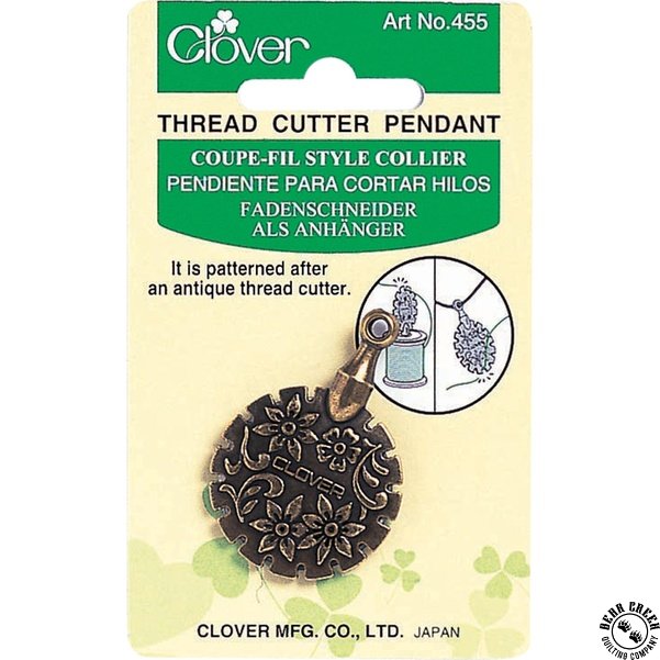 The Clover Thread Cutter Pendant is the most convenient way to snip thread. A little over an inch in diameter, it has a hole for a chain or ribbon, and notches all around the edge with a cutting surface deep in the notch. Run your thread over one of the notches and you will have a clean cut. The notches are small enough so it is impossible to cut yourself. Perfect for travel, too!