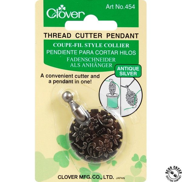 The Clover Thread Cutter Pendant is the most convenient way to snip thread. A little over an inch in diameter, it has a hole for a chain or ribbon, and notches all around the edge with a cutting surface deep in the notch. Run your thread over one of the notches and you will have a clean cut. The notches are small enough so it is impossible to cut yourself. Perfect for travel, too!
