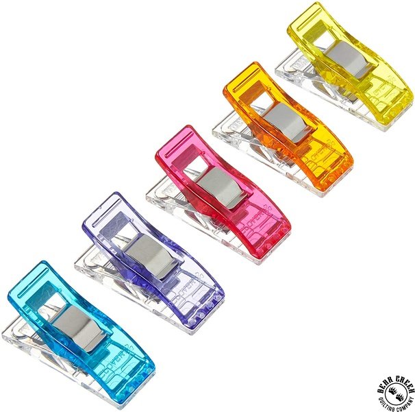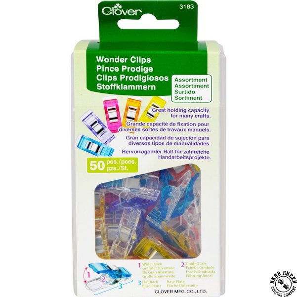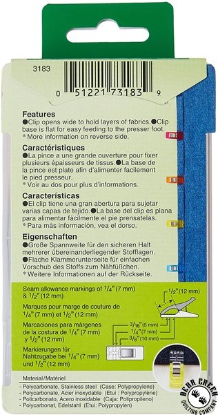 Clover Wonder ClipsClip and hold, Clip and Sew, right where you need it! Clover Wonder Clips have a wide opening for holding multiple layers of fabric. It won't damage or distort the fabric. The base is flat for easy feeding to presser foot with 1/4 inch and 1/2 inch seam allowance markings on the base. The Wonder Clips are a great alternative to pins, especially when working with heavy weight fabrics, piles and vinyls. It can hold layered sections of sewing projects such as handle connectors to handbags and piping without distortion. Wonder Clips are easy to see and find when dropped on the floor.
