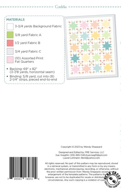 Cordelia Quilt Pattern View Larger Image Price: SALE $8.39 4 item(s) available. Item # PTN-WS67 | Reg. $11.99 Tweet Pin It Cordelia Quilt PatternFeaturing the Buds and Butterflies fabric collection by Riley Blake Designs. Pattern and instructions; fabric not included Finished size is 61 inches by 74 inches Authored by and Published by Wendy Shepphard Copyright 2024 Related Products Friendly Neighborhood Quilt Pattern Item # PTN-WS70 | Reg. $11.99 SALE from $8.39