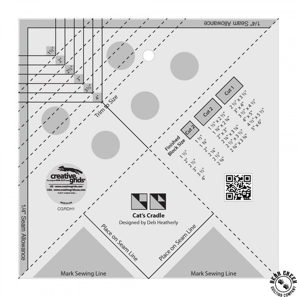 Make Cat's Cradle units quickly, easily and accurately, two at a time from squares and rectangles. You never cut a single triangle, but with the Cat's Cradle tool you end up with perfect triangles in your finished blocks every time. Create six sizes from 1 1/2 inches to 4 inch finished blocks; the cutting requirements for each is printed right on the ruler! The ruler slides easily over the fabric until pressure is applied. Then, the exclusive gripper holds the fabric in place while cutting, eliminating slipping and mis-cuts.