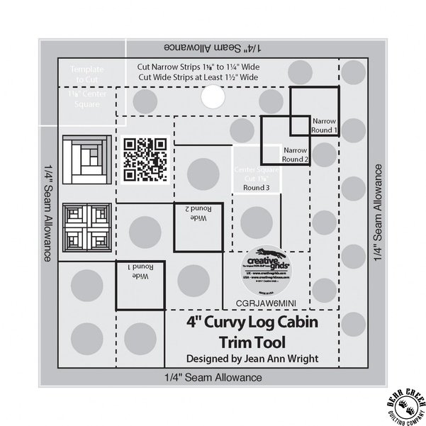 Create the illusion of curves with this Curvy Log Cabin Trim Tool. Sew four blocks together to, piece a circle which finishes to 8 inches. Combine these blocks with other 4" blocks for unlimited design possibilities. The cutting requirements for the center square and the narrow and wide strips are printed right on the ruler. It doesn’t get any easier than this! The tool features easy-to-read black and white markings and the popular Creative Grids grip. The ruler slides easily over the fabric until pressure is applied; then, our exclusive gripper holds the fabric in place while cutting, eliminating slipping and miss-cuts!