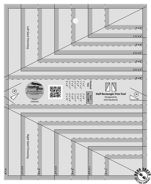 Half Rectangle Trim Tool by Creative Grids The Half Rectangle Trim Tool from Creative Grids makes half rectangle units in seven different sizes. Make the half rectangle units with either a right or left slanting seam. Cutting chart is printed right on the tool, along with trim lines for perfect half rectangle units every time. A & B trims make it easy to line up the triangles for sewing. Since half rectangles have a different angle than half square triangles, an extra 1/8" indent is added in the final trimming so that when sewn into a project, the seam lines will go corner to corner. The ruler slides easily over the fabric until pressure is applied. Then, our exclusive gripper holds the fabric in place while cutting, eliminating slipping and miss-cuts! Easy to read black and white markings. Cutting chart printed right on the tool. Create seven different sizes of half rectangle units that range from 1in x 2in to 4in x 8in finished sized. Comes with fully illustrated step by step instructions.