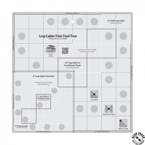 The Log Cabin Trim Tool Two Template features exclusive markings to create perfect 6 or 12 inch finished Log Cabin; Half Log Cabin; or Courthouse Steps blocks. Does not matter which size you choose, they are both constructed in the same way. After adding each round of logs, place the appropriate centering square on the ruler over the finished center square and trim. Since each round is squared up before the next set of logs are added, the results are spectacular. The cutting requirements for the center square and the strips are printed right on the ruler. The template slides easily over the fabric until pressure is applied. Then, our exclusive gripper holds the fabric in place while cutting, eliminating slipping and miss-cuts! The template comes with fully illustrated step by step instructions or scan the QR Code printed on the template to view a video demonstration.
