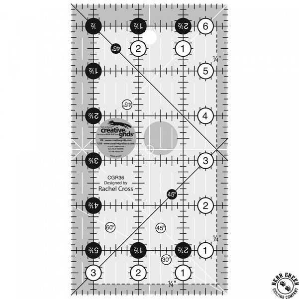 This 3-1/2 inch x 6-1/2 inch rectangle ruler features easy-to-read black and white markings printed in 1 inch grids marked in 1/8 inch and 1/4 inch increments. Use the easy-to-read, black numbers (printed on white dots) and the 1/4 inch grip sides to cut whole inches. The 1/4 inch dashed lines printed on two adjoining sides aid in trimming seam allowances. Use the patented Turn-A-Round feature designated by the easy to read, numerical white numbers (printed on black dots) and the 1/2 inch grip sides to add the 1/2 inch seam allowance. Use the white 45 degree angle to trim half-square triangles in whole inch increments. Use the black 45 degree angle to trim half-square triangles in half inch increments. These 45 degree lines cross 1/4 inch away from the outside edge. Use these markings to square up flying geese units; squares set on point or mark cross-hatching. The ruler also features a 30 degree / 60 degree angle. White horizontal and vertical lines are printed on the rectangle so the center of the ruler is easily distinguishable. Use these lines to fussy cut stripes and borders. The ruler slides easily over the fabric until pressure is applied. Then, our exclusive gripper holds the fabric in place while cutting, eliminating slipping and miss-cuts!