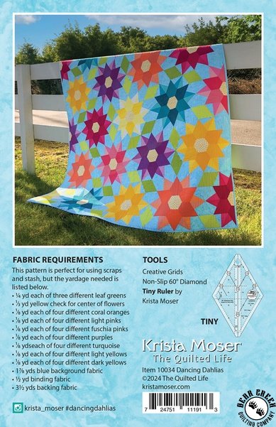 Dancing Dahlias Quilt Pattern View Larger Image Price: $11.99 3 item(s) available. Item # PTN-TQL10034 Tweet Pin It Dancing Dahlias Quilt PatternFun Scrap Quilt! Pattern and instructions; fabric not included Finished quilt measures 56 inches by 60 1/2 inches Designed by Krista Moser Published by The Quilted Life Copyright 2024 Required tools: Creative Grids 60 Degree Tiny Diamond Ruler; sold separately Related Products Creative Grids 60 Degree Diamond Ruler Item # CGR60DIA+PTN $37.99 Creative Grids 60 Degree Mini Diamond Ruler Item # CGR60DIA-MINI+PTN $24.99 Creative Grids 60 Degree Tiny Diamond Ruler Item # CGR60DIA-TINY+PTN $19.49