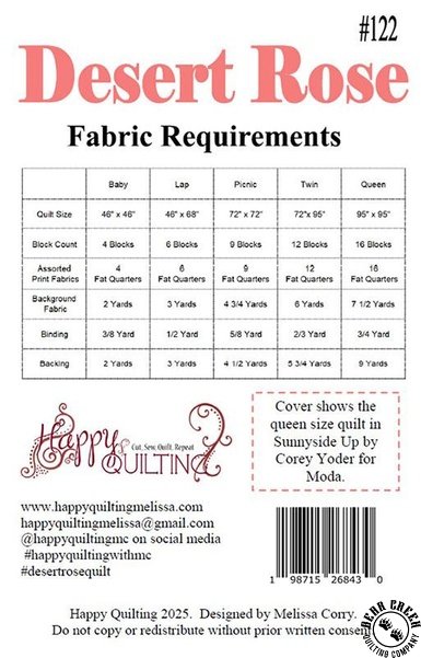 Desert Rose Quilt Pattern View Larger Image Price: SALE $8.39 6 item(s) available. Item # PTN-HQ122 | Reg. $11.99 Pin It Desert Rose Quilt PatternFeaturing the Brookside fabric collection by Moda. Pattern and instructions; fabric not included Finished size: Baby = 46 inches by 46 inches Lap = 46 inches by 68 inches Picnic = 72 inches by 72 inches Twin = 72 inches by 95 inches Queen = 95 inches by 95 inches Designed by Melissa Corry Published by Happy Quilting Copyright 2025 Related Products Brookside Charm Pack Item # 36080PP | Reg. $12.99 SALE from $9.09 Brookside Fat Quarter Bundle by Moda Item # 36080AB | Reg. $134.99 SALE from $94.49 Brookside Jelly Roll by Moda Item # 36080JR | Reg. $49.99 SALE from $34.99 Garden Lattice Quilt Pattern Item # PTN-MOD149 | Reg. $9.99 SALE from $6.99 Moda Brookside Bramble Floral Blossom Item # 36081-12 | Reg. $12.99 SALE from $9.09 Moda Brookside Bramble Floral Lake Item # 36081-18 | Reg. $12.99 SALE from $9.09 Moda Brookside Bramble Floral Midnight Item # 36081-19 | Reg. $12.99 SALE from $9.09 Moda Brookside Bramble Floral Sagebrush Item # 36081-16 | Reg. $12.99 SALE from $9.09 Moda Brookside Breezy Blossom Item # 36086-12 | Reg. $12.99 SALE from $9.09 Moda Brookside Breezy Breeze Item # 36086-15 | Reg. $12.99 SALE from $9.09 Moda Brookside Breezy Brooke Item # 36086-17 | Reg. $12.99 SALE from $9.09 Moda Brookside Breezy Cloud Item # 36086-11 | Reg. $12.99 SALE from $9.09 Moda Brookside Breezy Lake Item # 36086-18 | Reg. $12.99 SALE from $9.09 Moda Brookside Breezy Midnight Item # 36086-19 | Reg. $12.99 SALE from $9.09 Moda Brookside Breezy Terra Cotta Item # 36086-14 | Reg. $12.99 SALE from $9.09 Moda Brookside Forage Floral Breeze Item # 36080-15 | Reg. $12.99 SALE from $9.09 Moda Brookside Forage Floral Cloud Item # 36080-11 | Reg. $12.99 SALE from $9.09 Moda Brookside Forage Floral Midnight Item # 36080-19 | Reg. $12.99 SALE from $9.09 Moda Brookside Forage Floral Terra Cotta Item # 36080-14 | Reg. $12.99 SALE from $9.09 Moda Brookside Montauk Breeze Item # 36082-15 | Reg. $12.99 SALE from $9.09 Moda Brookside Montauk Lake Item # 36082-18 | Reg. $12.99 SALE from $9.09 Moda Brookside Montauk Midnight Item # 36082-19 | Reg. $12.99 SALE from $9.09 Moda Brookside Sun River Lake Item # 36083-18 | Reg. $12.99 SALE from $9.09 Moda Brookside Sun River Sagebrush Item # 36083-16 | Reg. $12.99 SALE from $9.09 Moda Brookside Sun River Terra Cotta Item # 36083-14 | Reg. $12.99 SALE from $9.09 Moda Brookside Sun River Yarrow Item # 36083-13 | Reg. $12.99 SALE from $9.09