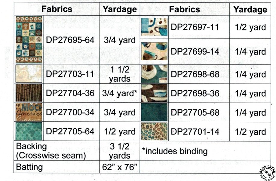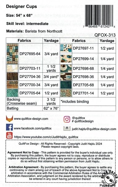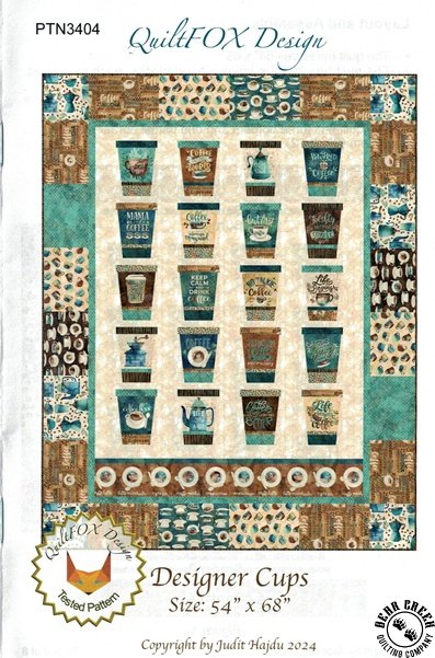 Designer Cups Quilt Pattern View Larger Image Price: SALE $10.49 4 item(s) available. Item # PTN-3404 | Reg. $14.99 Tweet Pin It Designer Cups Quilt PatternFeaturing the Barista fabric collection by Northcott. Pattern and instructions; fabric not included Finished size is 54 inches by 68 inches Authored byJudit Hajdu Published by QuiltFOX Design Copyright 2024 Related Products Fresh Start Quilt Pattern Item # PTN-3402 | Reg. $14.99 SALE from $10.49
