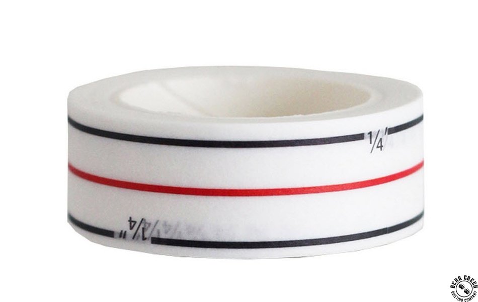 Place the Diagonal Seam Tape in front of the feed dogs of the sewing machine, with the red stitching line in line with the needle. The black lines represent a perfect 1/4" seam allowance, which helps guide fabric, make HST's without marking lines, and is a great help for beginners learning to sew and keeping long strips of fabric straight. Diagonal Seam Tape is washi tape, so it's strong, thin, and removes cleanly. Remove it after each project to prevent any residue on the machine.