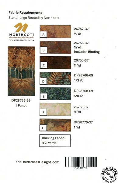 Dig Deep Quilt Pattern View Larger Image Price: $13.99 1 item(s) available. Item # PTN-3582 Pin It Dig Deep Quilt PatternFeaturing the Stonehenge Rooted fabric collection by Northcott. Pattern and instructions; fabric not included Finished size is 52 inches by 66 inches Designed by Kris Holden Published by Kris Holden Designs Copyright 2026 Related Products In The Forest Quilt Pattern Item # PTN-3583 $13.99 Northcott Stonehenge Rooted 108 Inch Wide Backing Fabric Agate Beige Item # BACKING-B28770-12 $24.99 Northcott Stonehenge Rooted Agate Beige Item # DP28770-12 $13.99 Northcott Stonehenge Rooted Agate Rust Item # DP28770-37 $13.99 Northcott Stonehenge Rooted Leaves Beige/Multi Item # DP28766-12 $13.99 Northcott Stonehenge Rooted Leaves Teal/Multi Item # DP28766-69 $13.99 Northcott Stonehenge Rooted Marble Dark Teal Item # DP28769-69 $13.99 Northcott Stonehenge Rooted Marble Light Teal Item # DP28769-66 $13.99 Northcott Stonehenge Rooted Panel Item # DP28765-69 $9.99 Northcott Stonehenge Rooted Pebbles Rust Item # DP28768-37 $13.99 Northcott Stonehenge Rooted Pebbles Teal Item # DP28768-69 $13.99 Northcott Stonehenge Rooted Trees Beige/Multi Item # DP28767-12 $13.99 Northcott Stonehenge Rooted Trees Teal/Multi Item # DP28767-69 $13.99