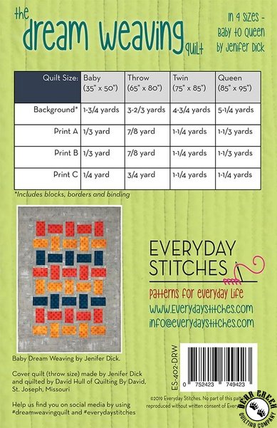 Dream Weaving Quilt Pattern View Larger Image Price: $11.99 5 item(s) available. Item # PTN-ES-402-DRW Pin It Dream Weaving Quilt PatternFeaturing the Collection for a Cause Essence fabric collection by Moda. Pattern and instructions; fabric not included Finished size is: Baby = 35 inches by 50 inches Throw = 65 inches by 80 inches Twin = 75 inches by 85 inches Designed by Jenifer Dick Published by Everyday Stitches Copyright 2025 Related Products Apricot Jelly Quilt Pattern Item # PTN-MOD145 $9.99 Collection for a Cause Essence Charm Pack by Moda Item # 46270PP $12.99 Collection for a Cause Essence Fat Quarter Bundle by Moda Item # 46270AB $159.99 Collection for a Cause Essence Jelly Roll by Moda Item # 46270JR $49.99 Collection for a Cause Essence Layer Cake by Moda Item # 46270LC $49.99 Moda Collections for a Cause Essence Blossoms Clover Item # 46274-14 $12.99 Moda Collections for a Cause Essence Blossoms Lavender Item # 46274-12 $12.99 Moda Collections for a Cause Essence Blossoms Parchment Item # 46274-11 $12.99 Moda Collections for a Cause Essence English Ivy Parchment Item # 46273-11 $12.99 Moda Collections for a Cause Essence English Ivy Plum Item # 46273-13 $12.99 Moda Collections for a Cause Essence English Ivy Soil Item # 46273-15 $12.99 Moda Collections for a Cause Essence Floral Paisley Lavender Item # 46270-12 $12.99 Moda Collections for a Cause Essence Floral Paisley Parchment Item # 46270-11 $12.99 Moda Collections for a Cause Essence Floral Paisley Plum Item # 46270-13 $12.99 Moda Collections for a Cause Essence Floral Stripe Clover Item # 46275-14 $12.99 Moda Collections for a Cause Essence Floral Stripe Lavender Item # 46275-12 $12.99 Moda Collections for a Cause Essence Floral Stripe Parchment Item # 46275-11 $12.99 Moda Collections for a Cause Essence Little Plaid Parchment Item # 46277-11 $12.99 Moda Collections for a Cause Essence Little Plaid Plum Item # 46277-13 $12.99 Moda Collections for a Cause Essence Little Plaid Soil Item # 46277-15 $12.99 Moda Collections for a Cause Essence Little Vine Parchment Item # 46276-11 $12.99 Moda Collections for a Cause Essence Little Vine Plum Item # 46276-13 $12.99 Moda Collections for a Cause Essence Little Vine Soil Item # 46276-15 $12.99 Moda Collections for a Cause Essence Meandering Path Lavender Item # 46272-12 $12.99 Moda Collections for a Cause Essence Meandering Path Parchment Item # 46272-11 $12.99 Moda Collections for a Cause Essence Meandering Path Soil Item # 46272-15 $12.99 Moda Collections for a Cause Essence Plums Clover Item # 46271-14 $12.99 Moda Collections for a Cause Essence Plums Parchment Item # 46271-11 $12.99 Moda Collections for a Cause Essence Plums Plum Item # 46271-13 $12.99 Moda Collections for a Cause Essence Shaded Solid Clover Item # 46279-14 $12.99 Moda Collections for a Cause Essence Shaded Solid Lavender Item # 46279-12 $12.99 Moda Collections for a Cause Essence Shaded Solid Parchment Item # 46279-11 $12.99 Moda Collections for a Cause Essence Shaded Solid Plum Item # 46279-13 $12.99 Moda Collections for a Cause Essence Shaded Solid Soil Item # 46279-15 $12.99 Moda Collections for a Cause Essence Trailing Vines Clover Item # 46278-14 $12.99 Moda Collections for a Cause Essence Trailing Vines Parchment Item # 46278-11 $12.99 Moda Collections for a Cause Essence Trailing Vines Plum Item # 46278-13 $12.99
