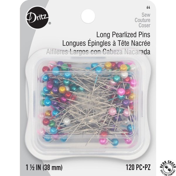 Pearlized plastic head pins in reusable storage box. Long pins with sharp points for decorative projects and crafts.