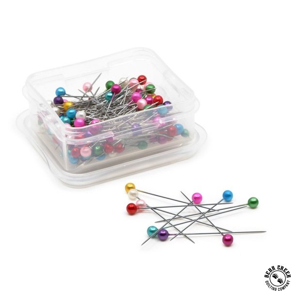 Pearlized plastic head pins in reusable storage box. Long pins with sharp points for decorative projects and crafts.