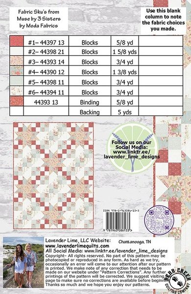 Easy Street One Quilt Pattern View Larger Image Price: SALE $8.99 4 item(s) available. Item # PTN-DLL245 | Reg. $14.99 Pin It Easy Street One Quilt PatternFeaturing the Muse fabric collection by Moda. Pattern and instructions; fabric not included Finished size is 54 1/2 inches by 72 1/2 inches Designed by Kathy Skomp and Bekah Pipes Published by Lavender Lime Copyright 2025 Related Products Bramble Blossom Quilt Pattern Item # PTN-ISE-298 | Reg. $11.99 SALE from $7.19 Moda Muse Flourishing Stone Item # 44391-15 | Reg. $11.99 SALE from $7.19 Moda Muse Flower Picking Slate Item # 44394-16 | Reg. $11.99 SALE from $7.19 Moda Muse Flower Silhouette Blush Item # 44395-14 | Reg. $11.99 SALE from $7.19 Moda Muse Flower Silhouette Stone Item # 44395-15 | Reg. $11.99 SALE from $7.19 Moda Muse Paisley Vine Blush Item # 44393-14 | Reg. $11.99 SALE from $7.19 Moda Muse Paisley Vine Porcelain Item # 44393-11 | Reg. $11.99 SALE from $7.19 Moda Muse Winding Leaves Scarlet Item # 44398-13 | Reg. $11.99 SALE from $7.19