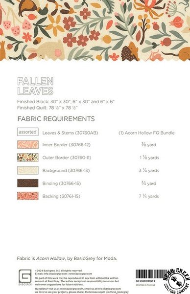 Fallen Leaves Quilt Pattern View Larger Image Price: SALE $8.39 2 item(s) available. Item # PTN-PAT083 | Reg. $11.99 Tweet Pin It Fallen Leaves Quilt PatternFeaturing the Acorn Hollow fabric collection by Moda. Pattern and instructions; fabric not included Finished size is 78 1/2 inches by 78 1/2 inches Designed by Rachel Brenchley Published by BasicGrey Copyright 2025