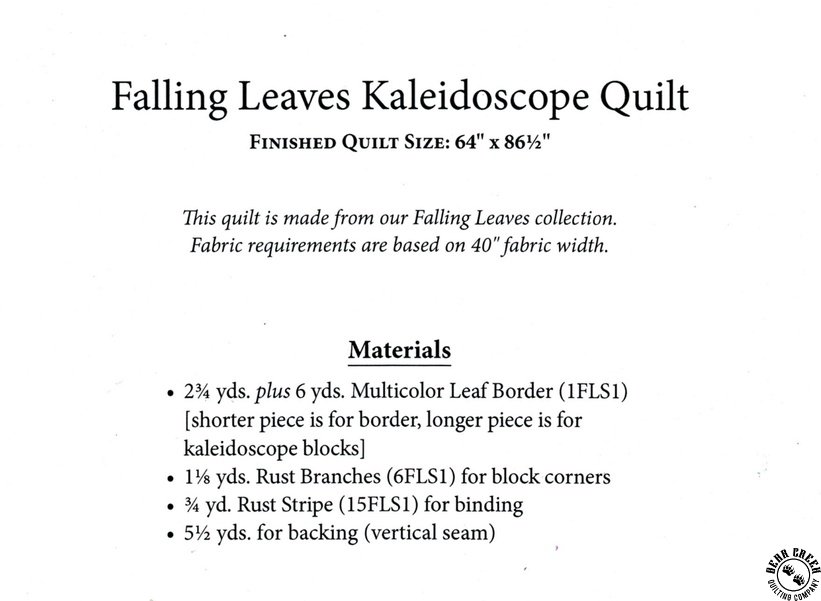 Falling Leaves Kaleidoscope Quilt Pattern View Larger Image Price: SALE $4.19 17 item(s) available. Item # PTN-FLSK-PATT | Reg. $5.99 Pin It Falling Leaves Kaleidoscope Quilt PatternFeaturing the Falling Leaves fabric collection by In the Beginning Fabrics. Pattern and instructions; fabric not included Finished size is 64 inches by 86 1/2 inches Designed by Jason Yenter Published by In The Beginning Fabrics Copyright 2025 Related Products Falling Leaves Quilt Pattern Item # PTN-FLSQ-PATT | Reg. $7.99 SALE from $5.59 In the Beginning Fabrics Falling Leaves Deco Multi Item # 11FLS-1 | Reg. $12.49 SALE from $6.26 In the Beginning Fabrics Falling Leaves Prism Multi Item # 10FLS-1 | Reg. $12.49 SALE from $6.26