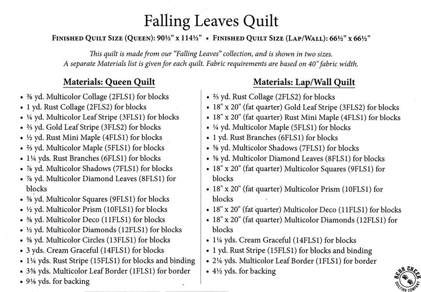 Falling Leaves Quilt Pattern View Larger Image Price: SALE $5.59 1 item(s) available. Item # PTN-FLSQ-PATT | Reg. $7.99 Pin It Falling Leaves Quilt PatternFeaturing the Falling Leaves fabric collection by In the Beginning Fabrics. Pattern and instructions; fabric not included Finished quilt measures: Small = 66 1/2 inches by 66 1/2 inches Large = 90 1/2 inches by 114 1/2 inches Designed by Jason Yenter Published by In The Beginning Fabrics Copyright 2025 Related Products Falling Leaves Kaleidoscope Quilt Pattern Item # PTN-FLSK-PATT | Reg. $5.99 SALE from $4.19 In the Beginning Fabrics Falling Leaves Deco Multi Item # 11FLS-1 | Reg. $12.49 SALE from $6.26 In the Beginning Fabrics Falling Leaves Prism Multi Item # 10FLS-1 | Reg. $12.49 SALE from $6.26